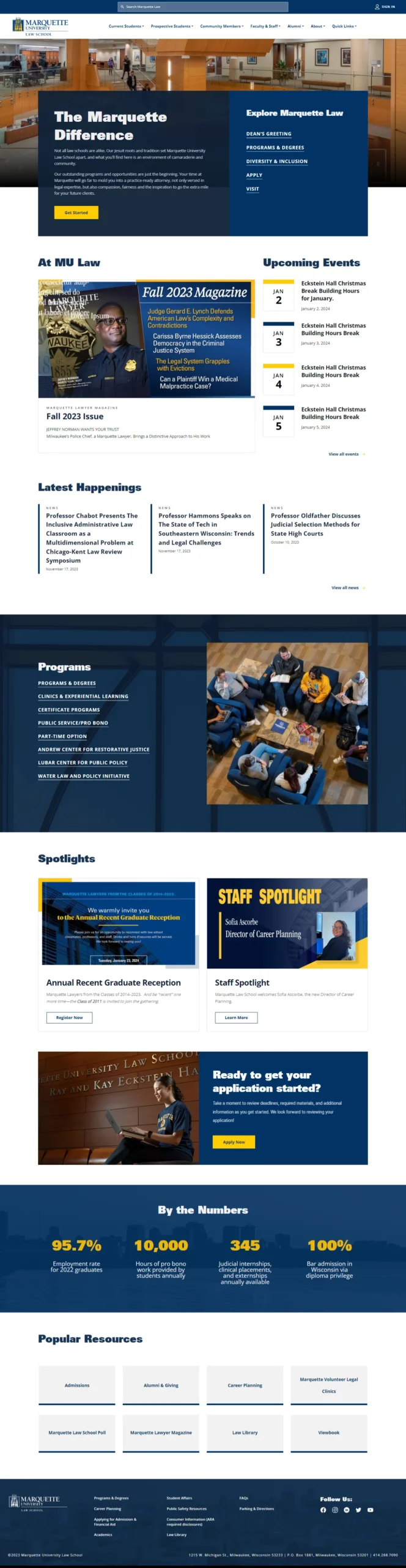 Design and development of the Marquette University Law School website to convey the camaraderie, community, diversity, and academic rigor inherent to the Marquette Difference, while ensuring quick access to needed information, ADA web accessibility compliance, and a component-based design system that enabled non-technical content editors to easily revise layouts and update content as needed.